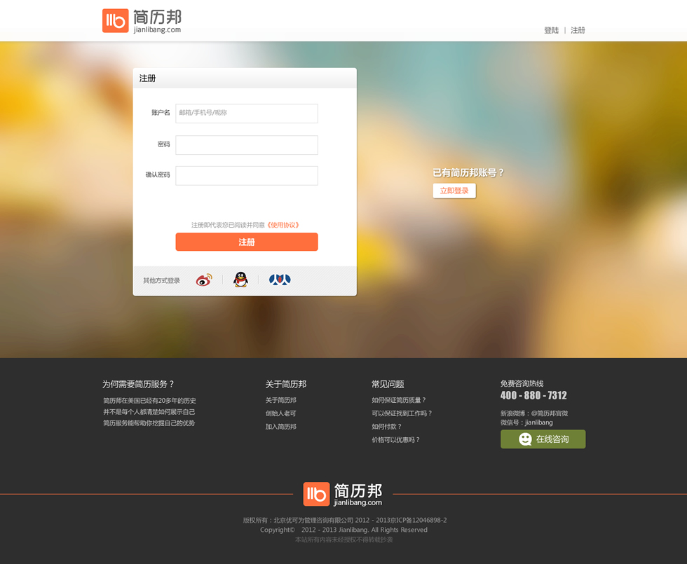 简历邦隶属于北京优可为管理咨询有限公司,专门提供简历诊断、简历写作、求职信写作、模板下载、面试辅导、职业规划等求职辅导服务。