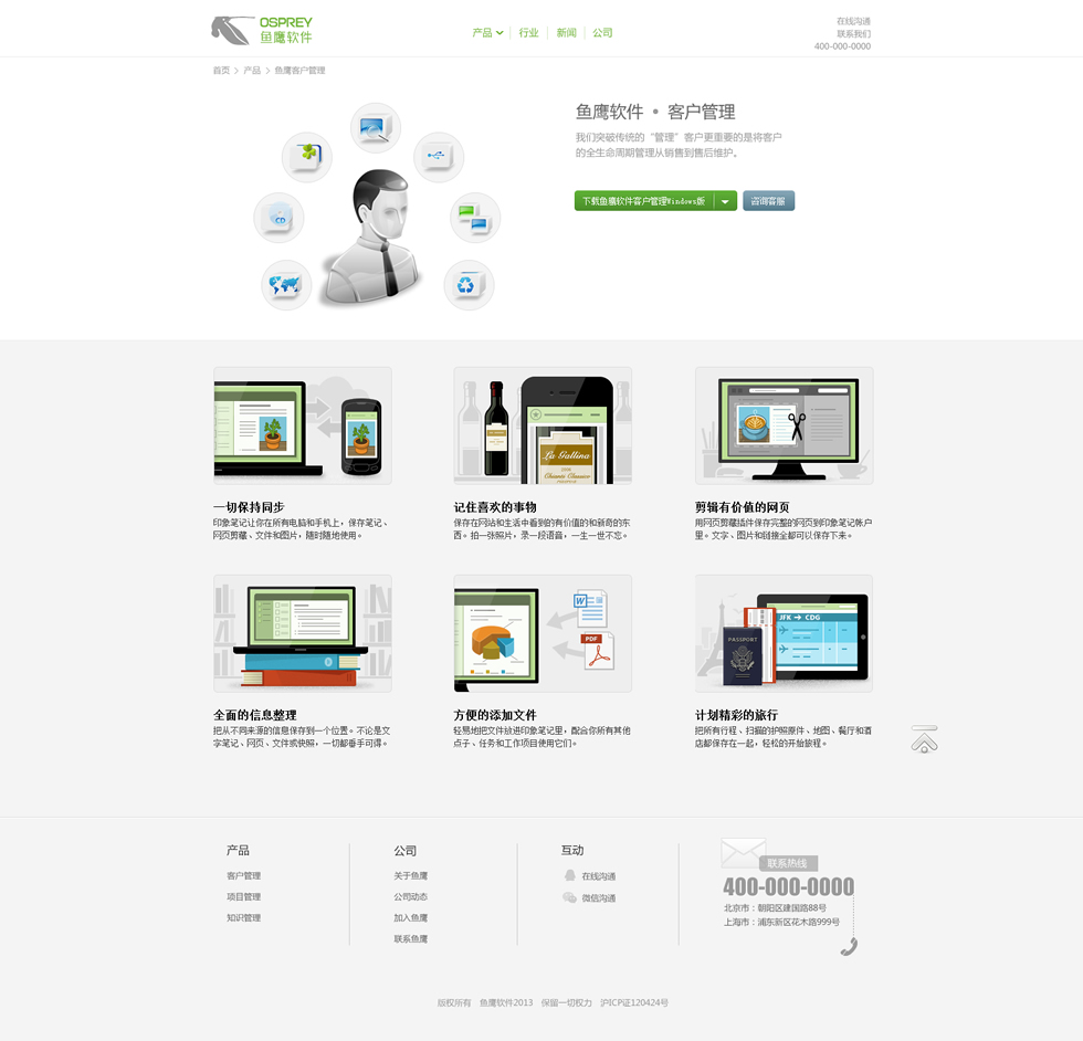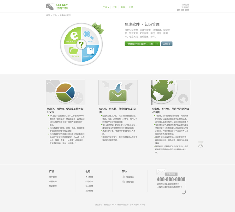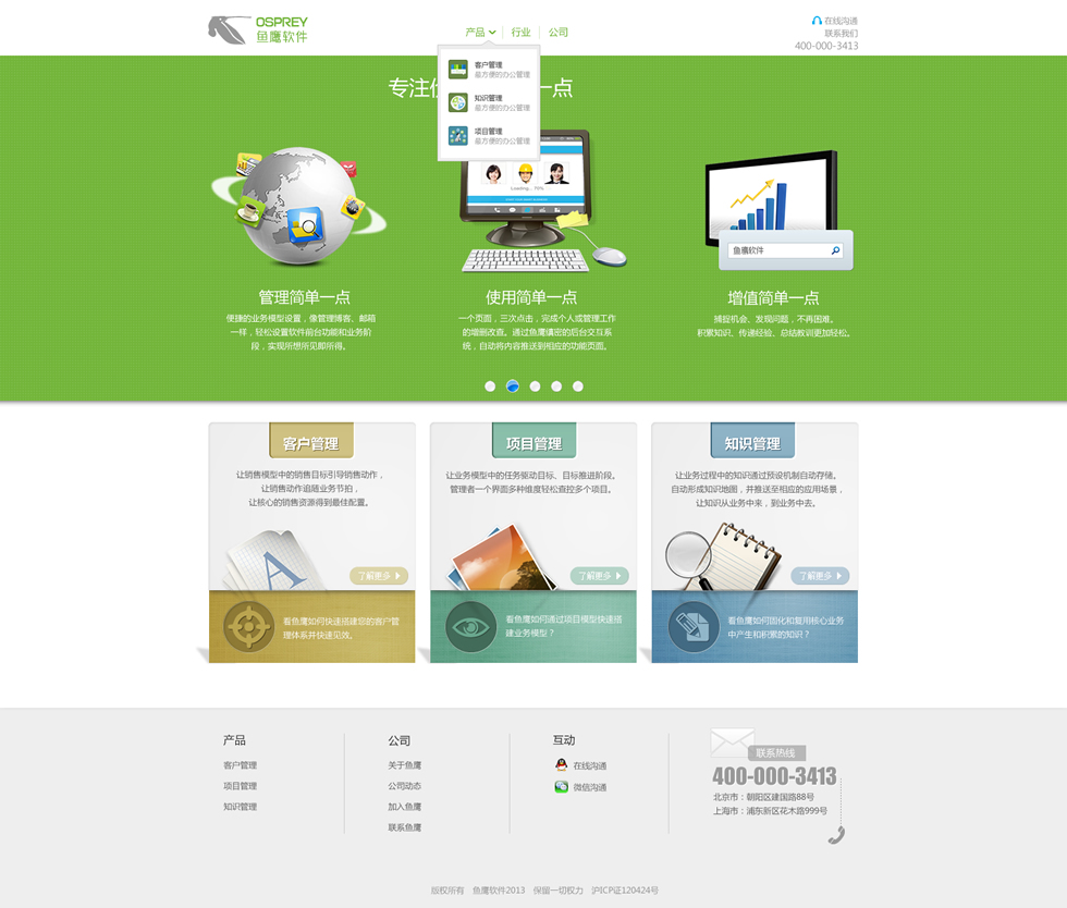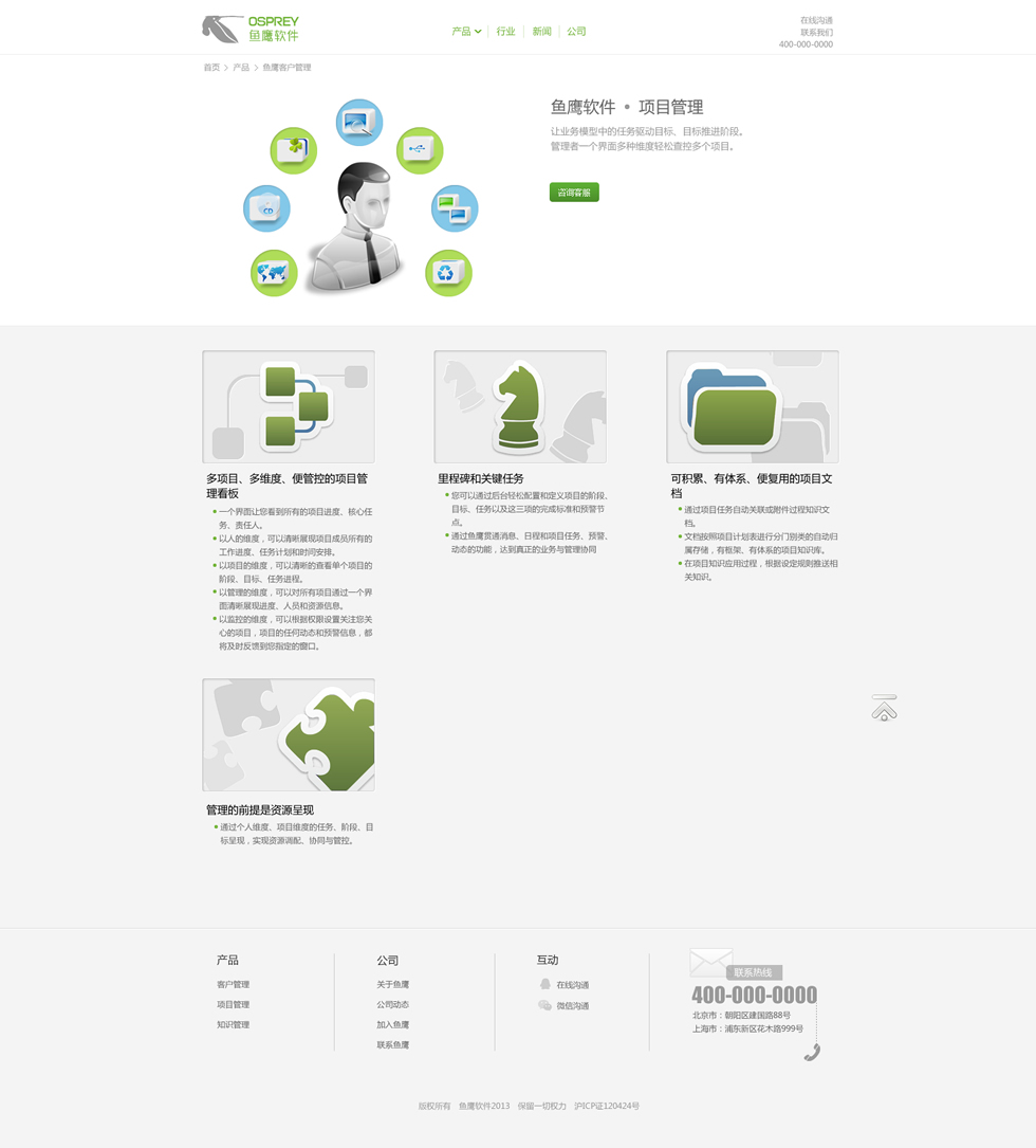 项目介绍:鱼鹰软件,2011年成立于北京。是一家以客户管理、项目管理、知识管理、费用控制与报销、协同办公平台五大产品为核心的IT解决方案综合提供商。