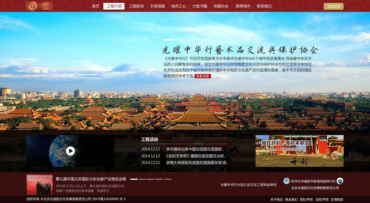 项目介绍:光耀中华行是向全世界宣传中华文化的大型公益文化工程,源于国家文化战略,基于新华社全国33个分社,全球160多个分支机构,集百名权威文化专家联手打造光耀中华行大型公益文化工程