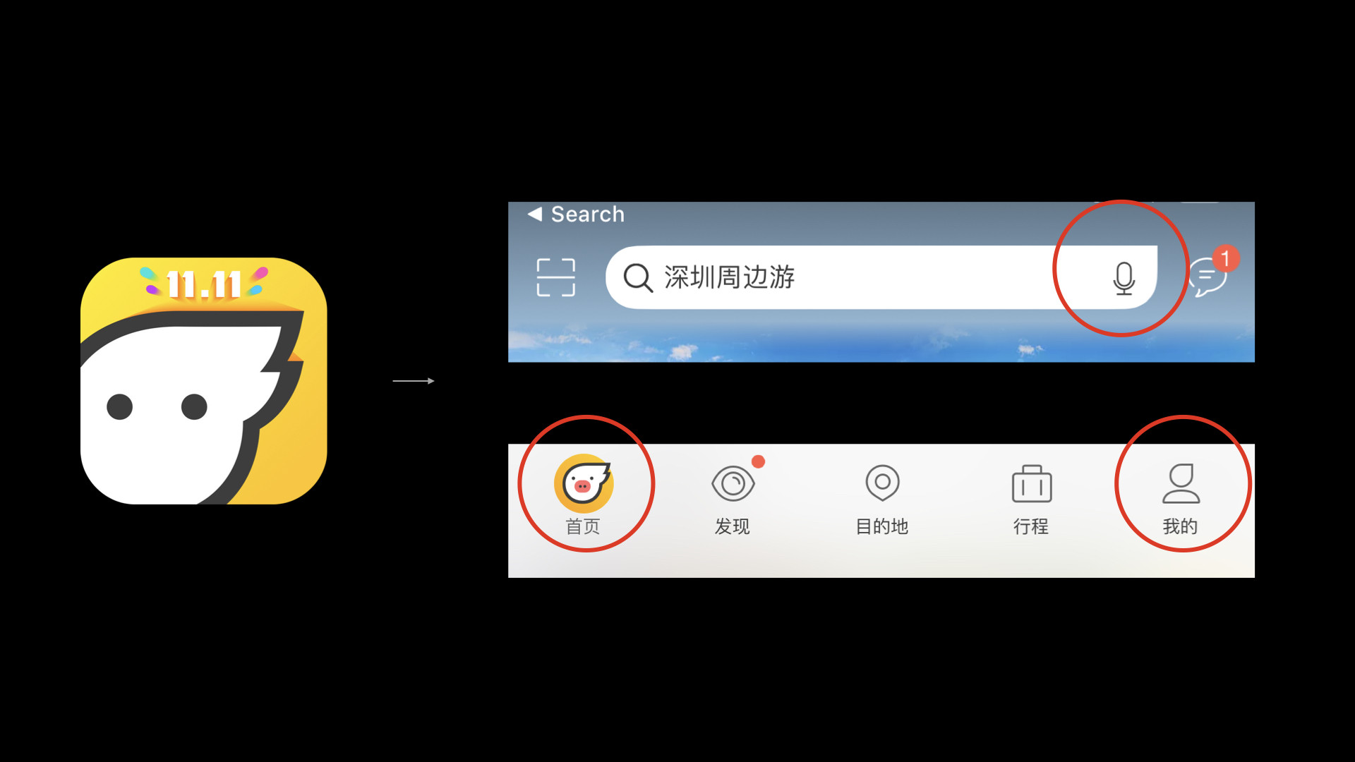 从品牌Logo就可以得到很多可应用的元素,比如:造型特点、风格、质感。常见的做法是将logo直接作为tab icon使用。但飞猪做得更多,设计师提取了Logo猪的发型形状,作了简化(提取轮廓)和添加修饰(首页icon的猪鼻子),再应用到Search bar 和 Tab icon中,有很高的识别度。