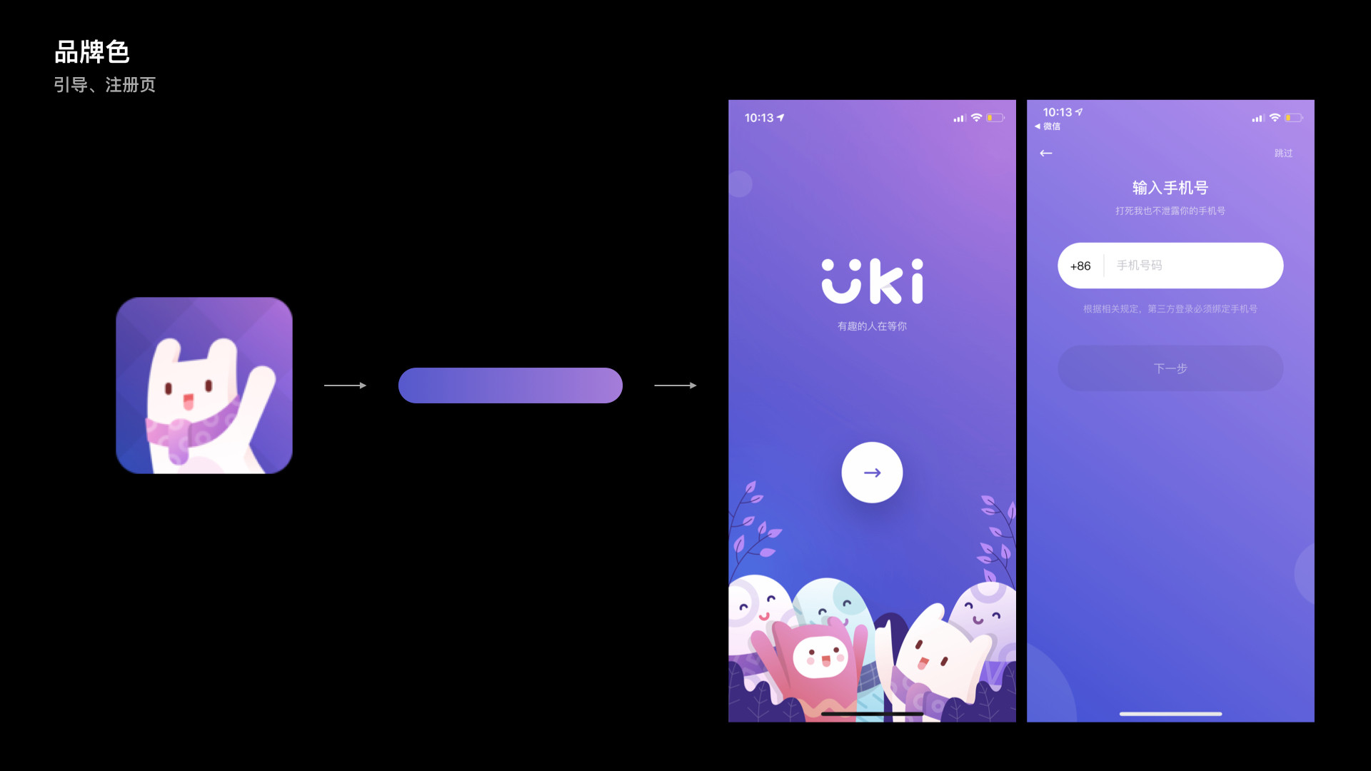 引导注册页:品牌主色用在引导页和注册等界面背景。因为这些是用户初次使用产品的时候,在这种场景用大量品牌色能让用户快速形成初步的品牌感知。