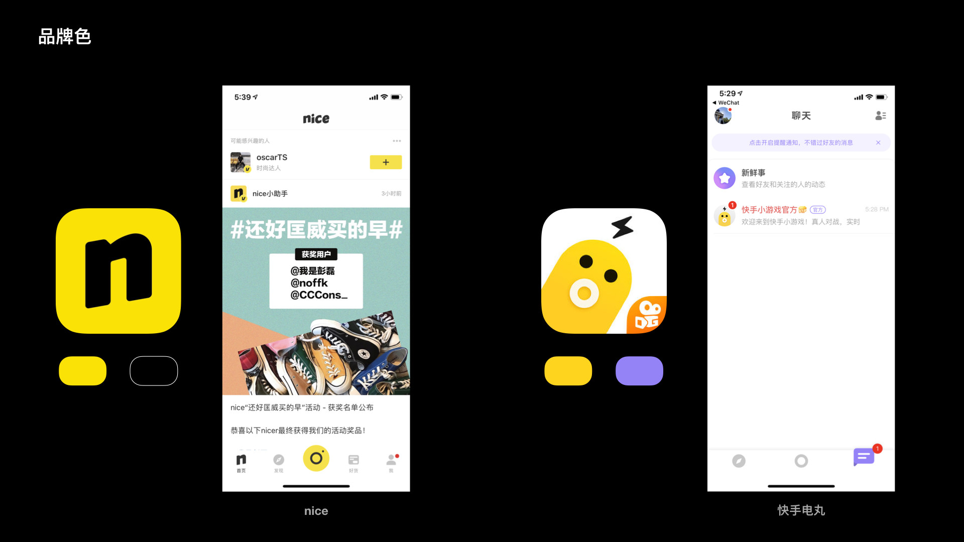 电丸和nice的APP Icon都是黄黑配色,但是在产品中的配色思路却不同。nice采用了大多数产品的做法,即沿用icon的黄色和黑色,电丸则是选用了对比色紫色作为组件和高亮色。可能是因为产品本身调性定位在可爱和有趣,所以配色方案也大胆地采用对比配色,来丰富视觉营造氛围。