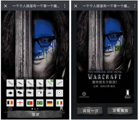 H5主题是主演你自己的魔兽,在两幅海报中选择自己喜欢的海报风格,上传自己露出五官的照片,在成型的海报上加上伤疤、眼睛等装饰物,点击完成,即完成海报制作,可以生成海报并可以分享朋友圈。