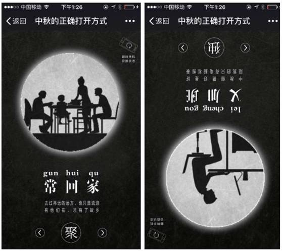 案例以中秋的正确打开方式为主题,通过“聚”“独”两种状态,体现中秋的不同状态,也是生活中的不同状态,达到共鸣。对比的时候,翻转手机180度,切换状态,非常有特色。