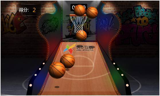 用手机控制篮球的方向和速度,瞄准篮框投球,最后15秒,篮框会移动,增加了游戏难度,游戏还可以与公众号进行关联,典型的线下吸粉神器。