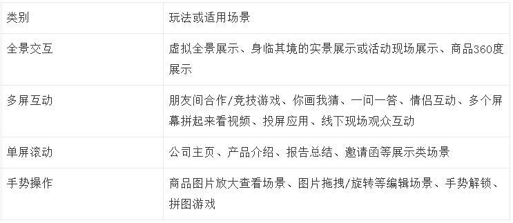 全景交互指将用户置于一个360度环绕的图片/视频环境下进行沉浸式的体验,用户可以通过转动手机或滑动屏幕来看这个环境里不同角度的内容并进行交互。如果将内容分成左右两个屏,带上VR眼镜,则可以进行VR体验。此玩法比较适合的场景有虚拟全景展示、身临其境的实景展示或活动现场展示。与此类似的还有商品的360度展示,用户拖动商品即可看到不同角度下商品的样子。