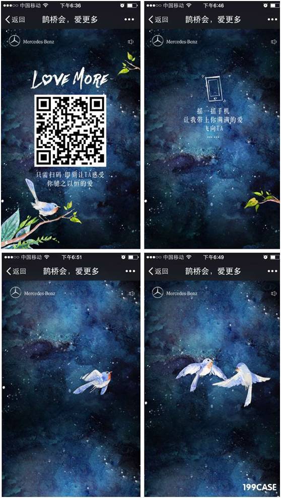 以鹊桥会为主题,扫码进入页面,摇动手机,画面开始展现,一台奔驰汽车试过桥面,到达红色的爱心交汇的地方,画面最后是一台红色奔驰车朝着画面外,打开了明亮的车灯。