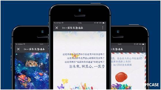 用色彩讲述故事,一次滑动之后全屏自动切换,美轮美奂,并有真声留言,最后送出邀请函,邀你参加一周年庆典。